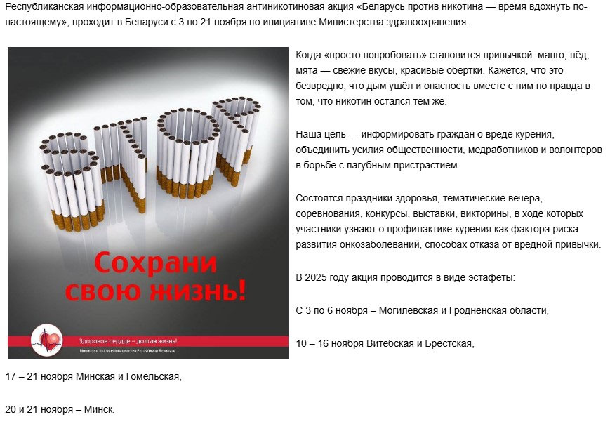 С 3 по 21 ноября 2025 года в Беларуси проходит республиканская антитабачная акция «Беларусь против никотина – время вдохнуть по-настоящему»